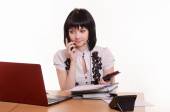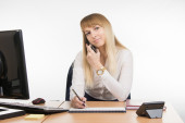 Business woman reads the contents of the document the other party on the phone