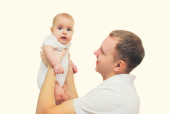 Tulenie noworodek szczęśliwy ojciec młody na białym tle