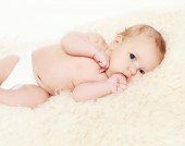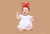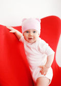 Portret słodkie małe dziecko dziewczynka leżący w czerwona spódnica na łóżku