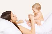 Szczęśliwą matką grać z dzieckiem w domu w białym pokoju