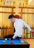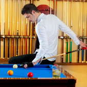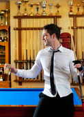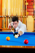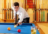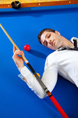 bilard zwycięzca przystojny mężczyzna gra z cue i kulki