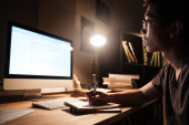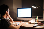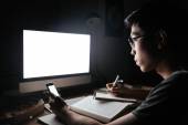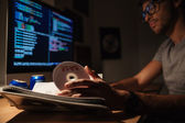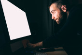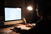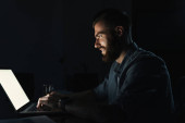 Człowiek siedzi w ciemnym pokoju i przy użyciu komputera