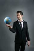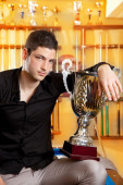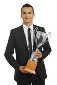 człowiek szczęśliwy zwycięzca dumny z wielkim trofeum srebrny Puchar
