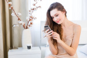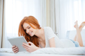 Uśmiechający się włos rudy korzystanie smartphone w łóżku