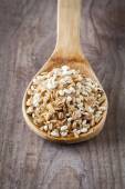organiczny Kasza jęczmienna na drewnianą łyżką i drewniane tła, portret zorientowany
