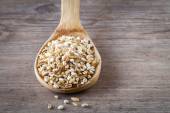 Organiczny Kasza jęczmienna na drewnianą łyżką i drewniane tła, krajobraz zorientowanych