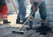 Ludzi ciężko pracujących na asfaltowych dróg z łopatami