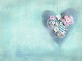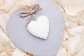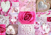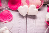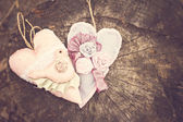 Styl Vintage ozdobne drewniane białe serca, z różowym pąki róż i na powierzchni tekstylnych, shabby chic i romantyczny.