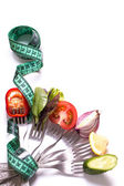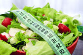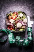 Pojęcie diety, sałatka składników na czarnym tle. Zdrowa żywność