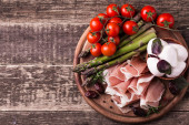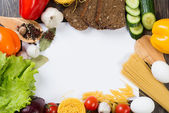 Pojęcie diety, sałatka składników na czarnym tle. Zdrowa żywność