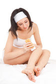 Sexy kobieta leżąc na łóżku biały