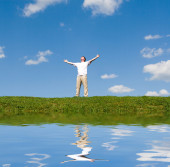 Szczęśliwa młoda kobieta marzy, aby latać na wiatry