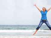 Szczęśliwa młoda kobieta marzy, aby latać na wiatry
