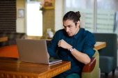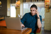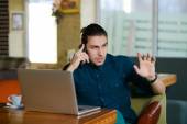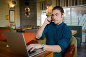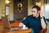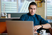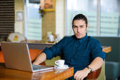 Młody człowiek, picia kawy i działa na laptopie w kawiarni