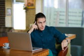 Zdjęcie "Młody człowiek, picia kawy i działa na laptopie w kawiarni" może być wykorzystywane do celów osobistych i komercyjnych zgodnie z warunkami zakupionej licencji Royalty-free. Obraz jest dostępny do pobrania w jakości wysokiej rozdzielczości do 5760x3840.