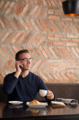 Zdjęcie "Młody człowiek, picia kawy i działa na laptopie w kawiarni" może być wykorzystywane do celów osobistych i komercyjnych zgodnie z warunkami zakupionej licencji Royalty-free. Obraz jest dostępny do pobrania w jakości wysokiej rozdzielczości do 5760x3840.