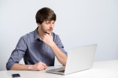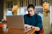 Młody człowiek, picia kawy i działa na laptopie w kawiarni