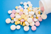 Różowe pigułki rozlewają się od butelki na niebieskim tle