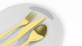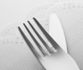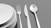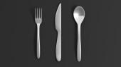 Silver widelec, łyżka i nóż z płyty, na białym tle.