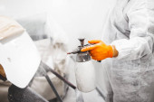Mężczyzna robotnik malarstwo deska z pistolet natryskowy sobie udzielono