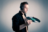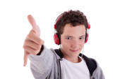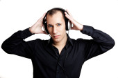 człowiek słuchania muzyki w słuchawkach, na białym tle na białym tle, łapka