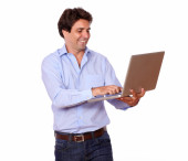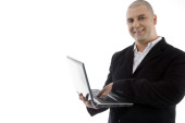 biznesmen, śmiejąc się, patrząc na komputerze, na białym tle na czarnym tle. łapka.