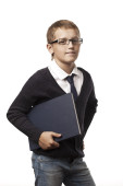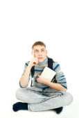 młody i piękny chłopiec siedzi na podłodze, z książkami, na białym tle na białym tle. łapka
