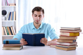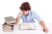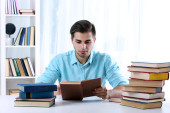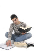 ładny chłopiec czytanie książek na podłodze, na białym tle biały, łapka