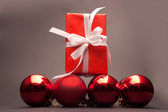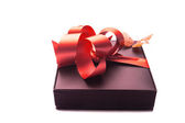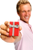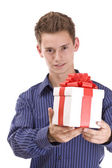 szczęśliwy młody człowiek, z czerwony na białym tle na białym tle, wyśmienity prezent.