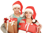 szczęśliwa para młodych, otwieranie prezentów obok choinki, na białym tle