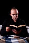 człowiek siedzi, czytanie książki, na białym tle biały, łapka.