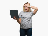 Portret zły kobieta krzyczeć na jej laptopie przeciwko szary ba