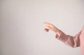 Kobieta ręką wskazując na pusty obszar na szarym tle