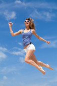 Piękna młoda kobieta z rozkoszą otworzyła dłonie na błękitne niebo