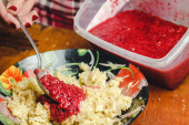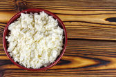 Deser słodkim twarogiem z dżemem malinowym w ceramicznej miski na drewnianym stole, miejsce na tekst