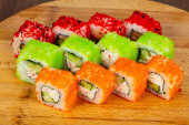 Zdjęcie "sushi maki pikantny "Tobiko" - gorąco rolki z różnego rodzaju "Tobiko" (" może być wykorzystywane do celów osobistych i komercyjnych zgodnie z warunkami zakupionej licencji Royalty-free. Obraz jest dostępny do pobrania w jakości wysokiej rozdzielczości do 5760x3840.