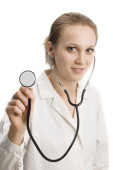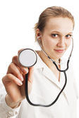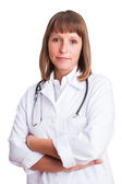Uśmiechnięta lekarka ze stetoskopem. Izolacja na białym tle