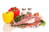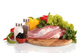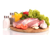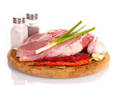 Surowe mięso i warzywa na deska na białym tle na Zielone Świątki?