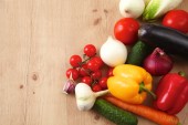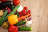 Kompozycja z drewnianym stole różnorodnych surowców organicznych warzyw