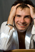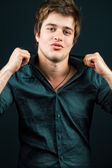 niedowierzaniem zabawny człowiek z brwi podniesione