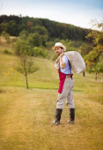 Wyświetlić zbliżenie mężczyzna gra na rury w tradycyjnym stylu. Na zewnątrz zielone lato pole tło
