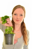 Szczęśliwa młoda kobieta posiadania zielonej sałaty i uśmiechnięty, na białym tle