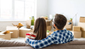 Przeprowadzka do nowego mieszkania. Szczęśliwa para rodzina i karton