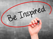 Ręką człowieka pisania Inspire z czarnym markerem na wizualne ekranie