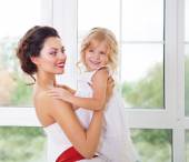 cute dziewczynka i jej matka, przytulanie pies szczeniaki