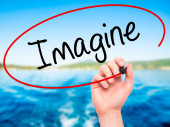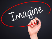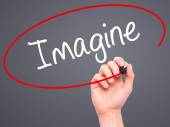 Człowiek w zapasie pismo Imagine z czarnym markerem na wizualne ekranie