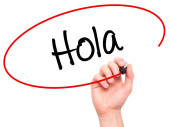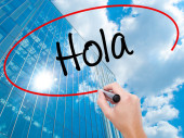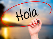 Człowiek w zapasie pismo Hola (Hello w języku hiszpańskim) z czarnym markerem na v