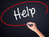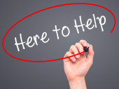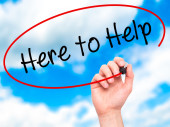 Ręką człowieka pisanie tutaj do pomocy z czarnym markerem na visual piargi