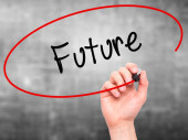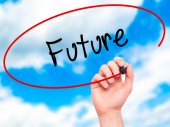 Człowiek w zapasie pismo przyszłości z czarnym markerem na ekranie programu visual