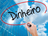 Ręką człowieka pisanie pieniędzy (Money w języku portugalskim) z czarnym marke